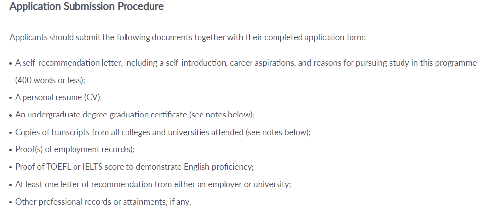 一封自荐信,包括自我介绍、职业抱负和参加本项目学习的原因(400字以下); 个人简历(CV); 大学本科毕业证书(见下面的注释); 就读的所有学院和大学的成绩单复印件(见以下注释); 就业记录证明; 托福或雅思成绩证明,以证明英语水平; 至少一封雇主或大学的推荐信; 其他专业记录或成就,如果有的话。