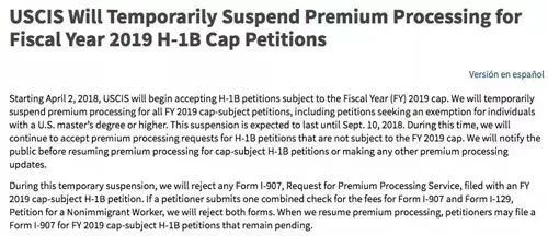 USCIS 官网的紧急通知:自 2018 年 4 月 2 日起,暂停所有需要抽签 (Cap-Gap) 的 H-1B 申请的加急处理 (Premium Processing) ,这一暂停可能持续长达六个月,直到 2018 年 9 月 10 日 。