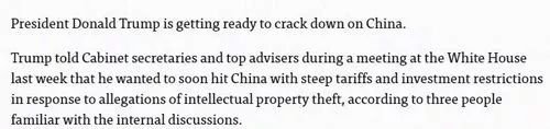 上周白宫的内部会议中,他告诉内阁秘书和一些高级决策官员自己希望尽快打击中国,设置高额关税壁垒和投资限制。这是对此前美国的技术资源被偷窃的报复。”