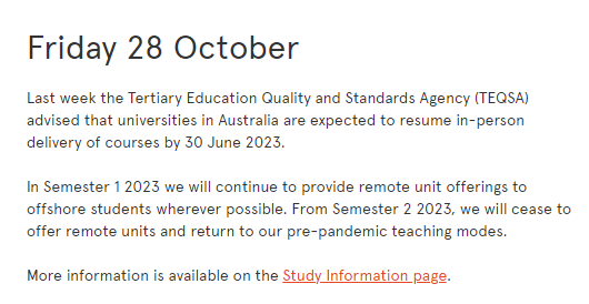 根据澳大利亚高等教育质量与标准署(TEQSA)发布的最新要求,从2023年6月30日起,所有持学生签证的国际学生都必须参加校园线下学习。什么意思?就是小伙伴们终于可以澳大利亚开启自己留学之旅啦!“线上云留学”的日子也成为过去式啦!最近一个月,澳洲各校陆续更新了2023年教学模式!今天我们就来看一看澳洲大学的教学模式都有哪些更新