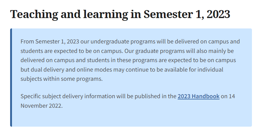 关于2023年第一学期的教学安排,RMIT表示考虑到仍有部分国际学生持续受到疫情的影响,而无法在短时间内来到墨尔本进行学习。RMIT将在可能的情况下继续为大家提供在线学习的选项,来保证身在海外的RMIT国际学生能继续学习。然而对于某些有特定认证要求的项目,大学可能无法提供在线学习的选项。