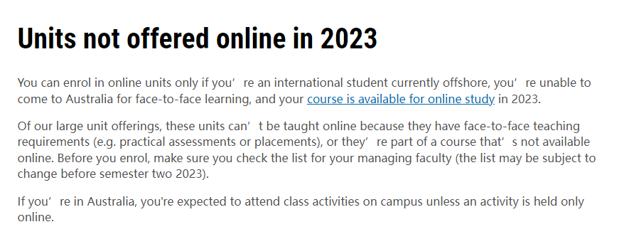 莫纳什大学宣布将于2023年继续提供灵活的学习方式:同时提供线上学习和线下学习两种方式,大家根据个人情况作出合理计划和安排。但请注意:有些课程因为有面对面授课要求,比如需要做实验或者实习,就无法提供线上学习。如果实在无法返回墨尔本,且想线上学习的课程并没有提供线上授课,学生可以联系Monash Connect寻求解决方案。