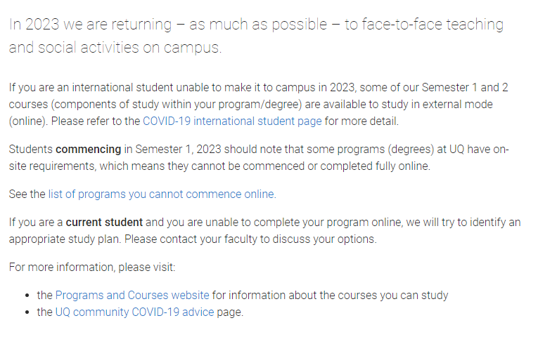 在2023年昆士兰大学将尽可能多的恢复线下授课专业,但如果学生在23年仍旧无法返回澳大利亚,那昆士兰大学将仍旧提供“校外(external)”模式进行线上学习。但需要注意的是,很多课程由于教学模式的原因不能线上授课,学生则需要返回校园。