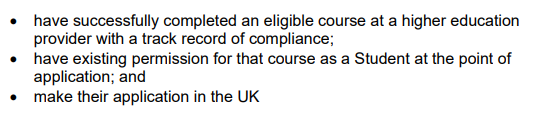 一般来讲,本科和硕士毕业生可以申请两年有效期签证,博士毕业生可以申请三年有效期签证,没有专业和国籍的限制。但需要注意的是,申请人必须在学签到期前,在英国境内完成该签证的申请。