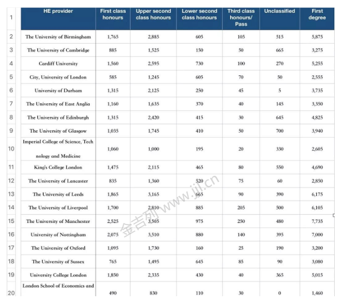 以上是英国华人比较多的20所高校的学位分布,也就是说,每年都有5-10%的学生是没有拿到学位的(一般即为辍学),排名为字母顺序。纵观数据,最难毕业应该是剑桥了,做图看看更直接的。