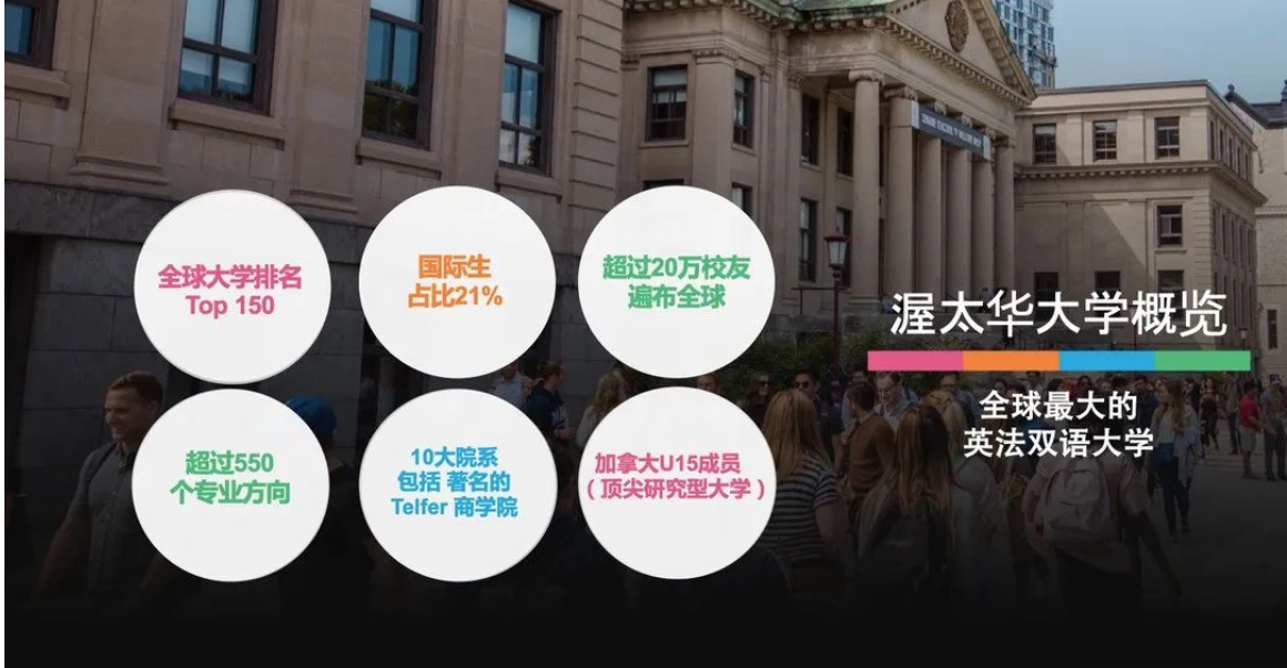 渥太华大学,拥有近200年历史,是 全球最大规模 的英法双语大学,也是 加拿大最古老的大学之一 。渥大拥有10大院系,其中Telfer商学院是 加拿大唯一一所 通过全球三大顶级商学院认证AMBA,AACSB和EQUIS的加拿大学校,法学院也是加拿大规模最大的法学院之一。 渥太华大学位于加拿大首都渥太华的市中心,从渥太华大学校园乘坐O-Train轻轨,只需要一站即可抵达渥太华火车站,从这里出发到蒙特利尔2个小时,多伦多4个小时,魁北克城5个小时。周五放学上车,还可以赶得上圣劳伦斯河畔的晚餐。