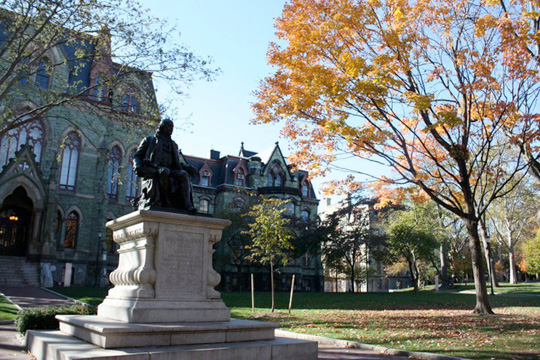 建立于1740年的宾夕法尼亚大学是美国第四古老的高等教育机构, 创始人:本杰明·富兰克林 自称为全美第一所现代意义上的综合性大学,同时也是教育创新的发源地:北美洲第一个医学院(1765年),第一个大学商学院(沃顿商学院,1881年),以及第一个学生会组织(1896年)都诞生于宾大。1779年,宾大改名为宾州大学(University of the State of Pennsylvania),成为美国第一所以&rquo;大学&rquo;(University)命名的高校;1791年,宾大正式更名为宾夕法尼亚大学。 宾夕法尼亚大学在艺术、人文、社会科学、建筑与工程教育上处于领先地位,其中最为知名的学科是商学、法学与医学。学校拥有约4,500名教授,近 10,000名全日制本科生与10,000多名研究生。