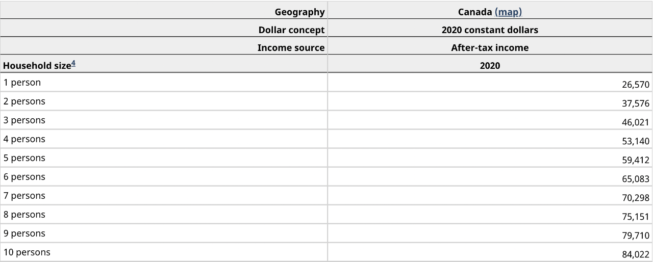 根据加拿大统计局公布的最新数据,加拿大单身人士2020年税后收入中位数为$26,570,2个人的家庭为$37,576,三口之家的收入中位数为$46,021,四口之家为$53,140。