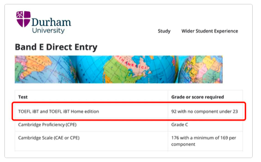 杜伦大学官网明确指出接受托福在家考成绩,托福分数最低要求是 总分92分(小分均≥23分)。