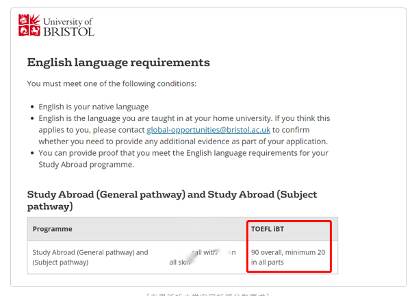 布里斯托大学官网明确指出接受托福在家考成绩,托福分数最低要求是 总分 90 分(小分均≥ 20 分)。