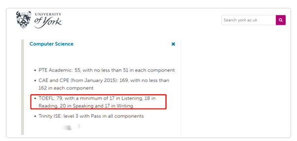约克大学官网明确指出接受托福在家考成绩,托福分数最低要求是 总分 79 分(写作和听力均≥ 17 分,阅读≥ 18 分,口语≥ 20 分)。