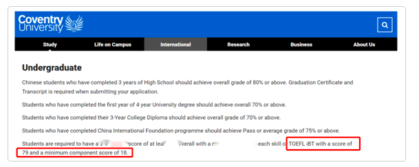 考文垂大学官网明确指出接受托福在家考成绩,托福分数最低要求是 总分79分(小分均≥18分)。
