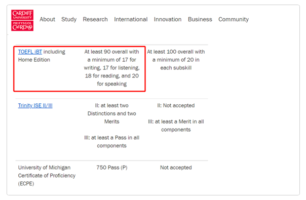 卡迪夫大学官网明确指出接受托福在家考成绩,托福分数最低要求是 总分 90 分(写作和听力均≥ 17 分,阅读≥ 18 分,口语≥ 20 分)。