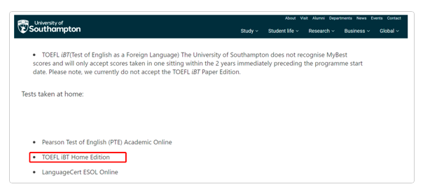 南安普顿大学官网明确指出 接受托福在家考成绩 ,托福分数最低要求是 总分 72 分(写作和听力均≥ 17 分,阅读≥ 18 分,口语≥ 20 分)。