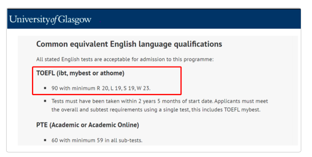 格拉斯哥大学官网明确指出接受托福在家考成绩,托福分数最低要求是 总分 90 分(口语和听力均≥ 19 分,阅读≥ 20 分,写作≥ 23 分)。