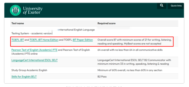 埃克塞特大学官网明确指出 接受托福在家考成绩 ,托福分数最低要求是 总分 87 分(小分均≥ 21 分)。