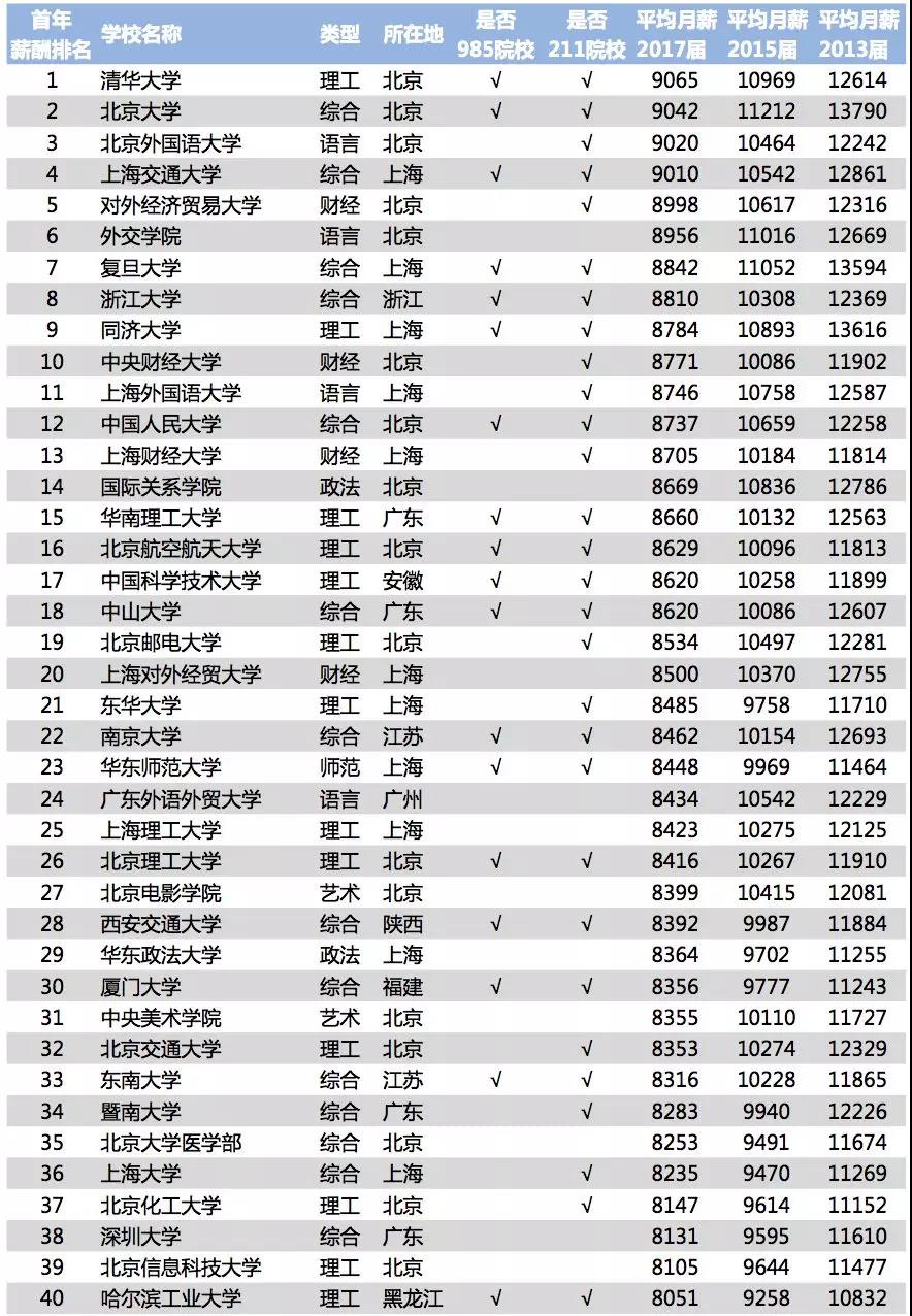 在前段时间发布的2018年中国大学毕业生薪酬排行榜出炉中,985、211高校毕业生薪酬水平大幅度领先普通高校;清华大学2017届毕业生平均薪酬最高,达到9065元。从专业上看,理学和工学类专业薪酬水平较高;农学、法学和管理学较低,大多数专业平均薪酬不到3000元。