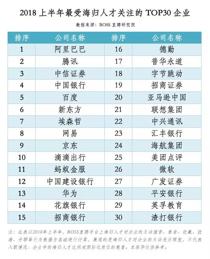 BOSS直聘研究院数据显示,中国本土创新科技企业实力不断提升,正越来越受到海归人才的欢迎。 2018 年,BOSS直聘平台上最受海归人才关注的 30 家企业中,科技企业占据 14 席,较 2015 年增加 5 席。其中阿里巴巴位居第一,腾讯第二,而百度位居第五,排名如下: