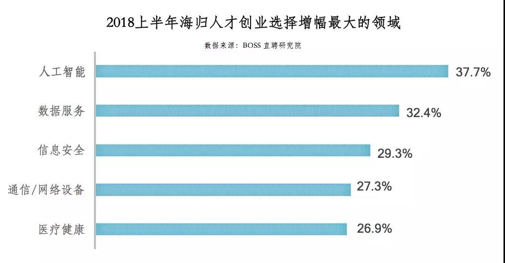 报告还称,越来越多的海归人才选择自主创业。从领域分布来看,随着技术型的创始人数量增加,科技领域逐渐成为海归创业主战场。人工智能、数据服务、信息安全因正值风口,市场成长空间巨大,成为 2018 年海归创始人最青睐的三大领域,创业者比例增速超过25%。