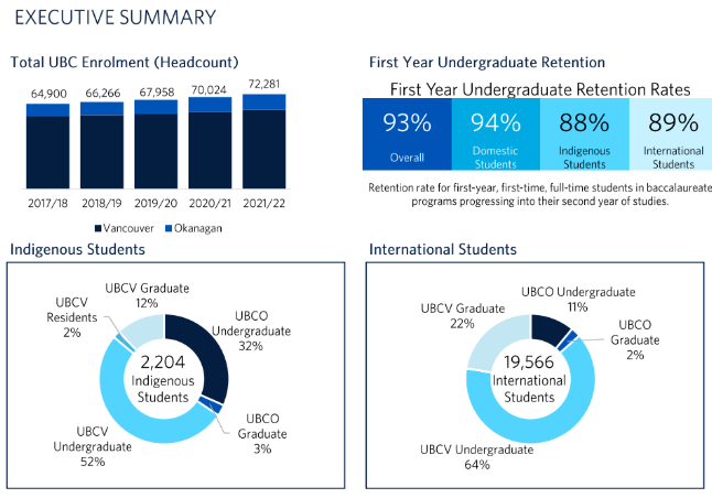 UBC在21-22学年全校总人数达72,281人,目前创历史新高, 留学生总人数达19,566人。