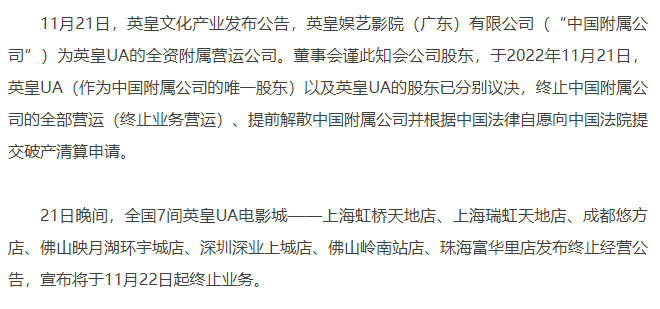 11月21日晚间,英皇UA影城也宣布, 全国7家影城22日起全部终止业务。
