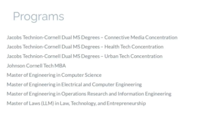 底下5个项目有MBA,CS,ECE,ORIE,还有Law是一年制的。上面3个项目是cornell tech比较有特色的专业,是connective media,health tech,urban tech都是两年制的,是cornell 跟Technion两个大学一起合作的项目,所以这3个项目的同学毕业了之后是能拿到两个学校的学位的,项目内容也是比较特色的,所以大家可以多了解一下各个项目,因为毕竟每个人是只能申请一个项目。