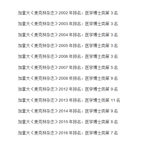 再来看看麦考林杂志医博类排名,但由于在20007年的时候西安大略大学就任性的表示,要退出麦考林杂志的排名,并且不再提供任何数据,所以这个排名数据只是来源于网络,仅供参考,仅供参考: