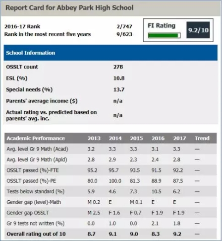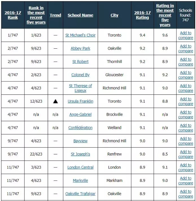 比如, 2016-2017 年度安省排名第一的是 TCDSB 的 St Michael’s Choir (Sr) School 中学,排名第二的是 HDSB 的 Abbey Park 和 YCDSB 的 St Robert Catholic High School 中学