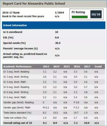 以安省为例,安省小学排名的主要依据全省 3 年级和 6 年级的数学,英语读写测试成绩进行排名( In Ontario, the elementary school ratings are base on provincewie test results in reaing, writing, an math skills. These tests are written by all stuents in grae 3 an in grae 6 )