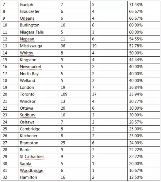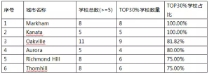 根据菲莎研究所发布的数据, 2016-2017 年度安省有 747 所学校参与排名,排名 TOP30% 的学校共计 245 所,按照学校数量 >=5 所,以下 6 个城市 Markham , Kanata , Oakville , Aurora , Richmon Hill , Thornhill 是 TOP30% 学校占比最高的城市,是目前最受留学生们青睐的城市。