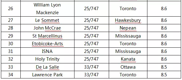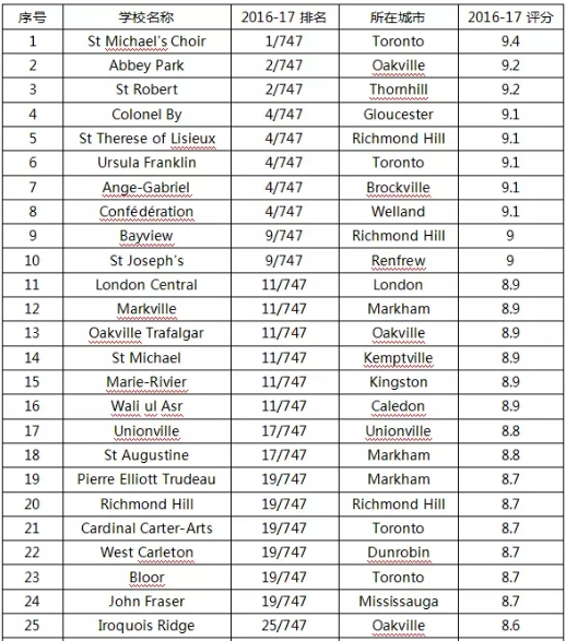 2016-2017 年度安省排名第一的多伦多天主基于的 St Michael’s Choir (Sr) School 中学,排名第二的是荷顿区公立教育局的 Abbey Park 和约克区天主教育局的 St Robert Catholic High School 中学。安省排名前 30% 的学校清单如下: