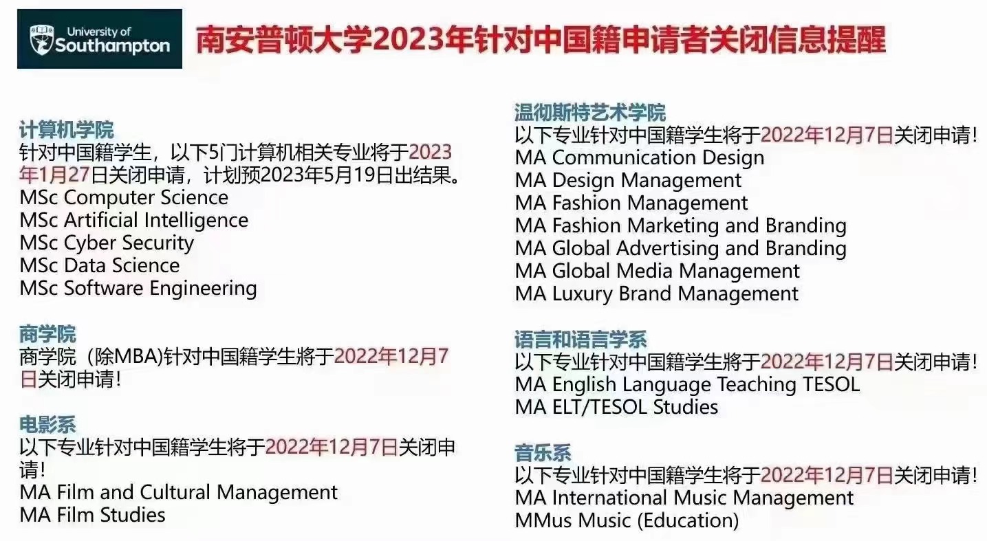 部分专业针对中国学生设置了不同的申请截止日期,请参考以下内容了解具体专业的申请截止时间: