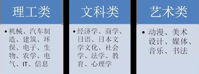 而日本大学的专业划分,主要有人文科学系统、社会科学系统、工学系统、理学系统、农学系统、医疗 / 看护系统、家政 / 生活科学系统、教育系统、艺术系统 9 大系统组成。因为每个国家大学的发展都是与这个国家的历史和现状息息相关的,不同国家有不同的发展轨迹,自然就有了不同的大学制度,虽然现在国际上很流行大学的全球化,重视互相的合作交流,扩招留学生和聘用外国教授,各种排行榜都把国际化当成重要的参考指标,但是专业划分依然有着每个国家自己的特点。