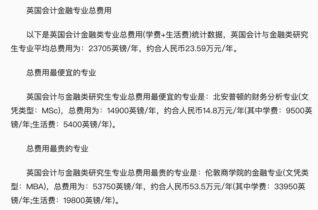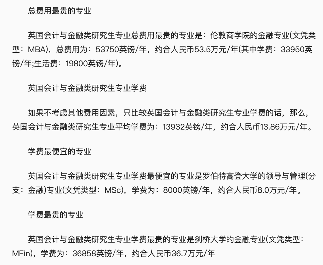 读英国金融硕士学费需要多少呢? 去英国留学,首先要了解到留学的基本费用,算好费用具体到到学校所在地、专业和住宿等等,英国金融硕士专业总的方向有主要有:财政、审计、银行、证券、税务、保险、会计、精算、货币、金融、财务、投资、风险、理财等等,且每个专业的要求不同费用也就不同,下面,我们来看看英国金融硕士学费的具体详情,希望能够提供帮助。