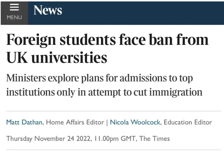 所有的误会来自于这么一篇泰晤士报的报道,说的是英国新任首相苏纳克正在考虑提高赴英留学门槛,以削减外国留学生的签证数量。