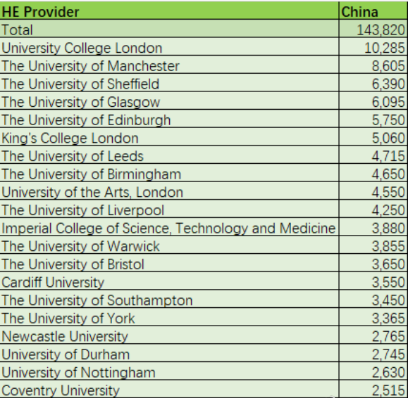 中国内地学生人数最多的十所大学还包括谢菲尔德大学、格拉斯哥大学、爱丁堡大学、伦敦国王学院、利兹大学、伯明翰大学、伦敦艺术大学和利物浦大学。