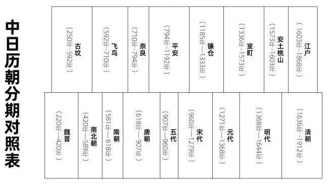 要 了解日本书法, 我们首先需要对日本的历史有一个大概的印象。 由于日本最早的文字是在中国的魏晋时期才出现的,所以下图的对照表我从中国的魏晋开始捋。