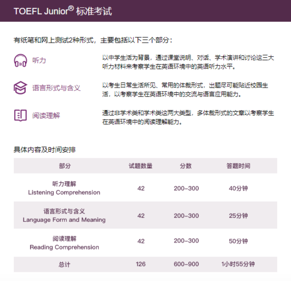 2、 TOEFL Junior 考试内容: