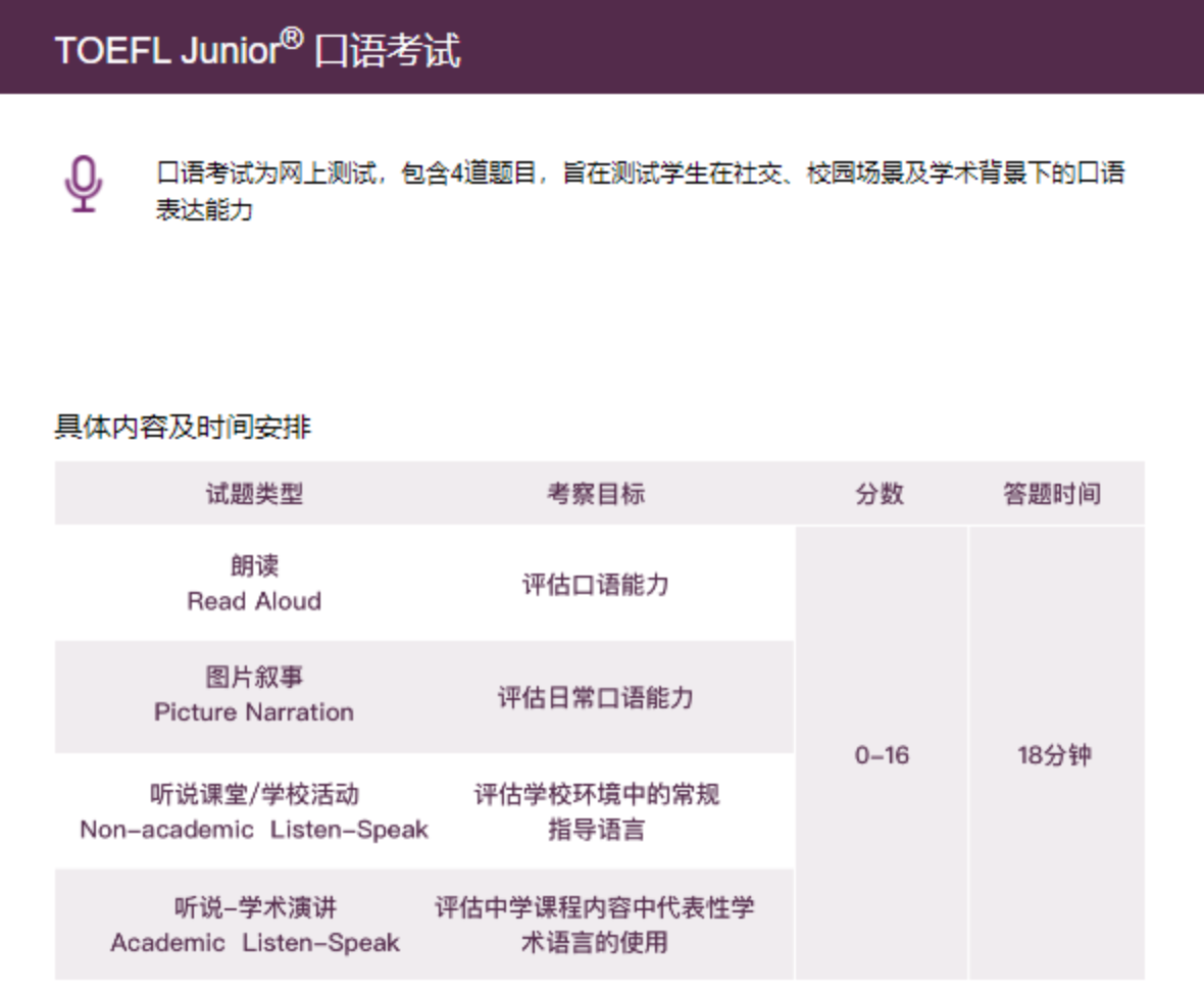 TOEFL Junior考试包含TOEFL Junior 标准考试 和TOEFL Junior 口语考试: