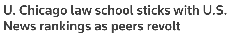 芝加哥大学法学院目前在U.S.News中排名全美第三。在一大堆此起彼伏的质疑和退出声中,芝加哥大学法学院是第一个宣布继续支持U.S.News的名校法学院。U.S.News将如何对待这些分化的大学,我们拭目以待!