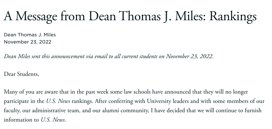 芝加哥大学法学院院长发表声明,表示在与学校领导、学院管理层和校友等沟通后,决定继续向U.S.News提供学校数据,参与排名。