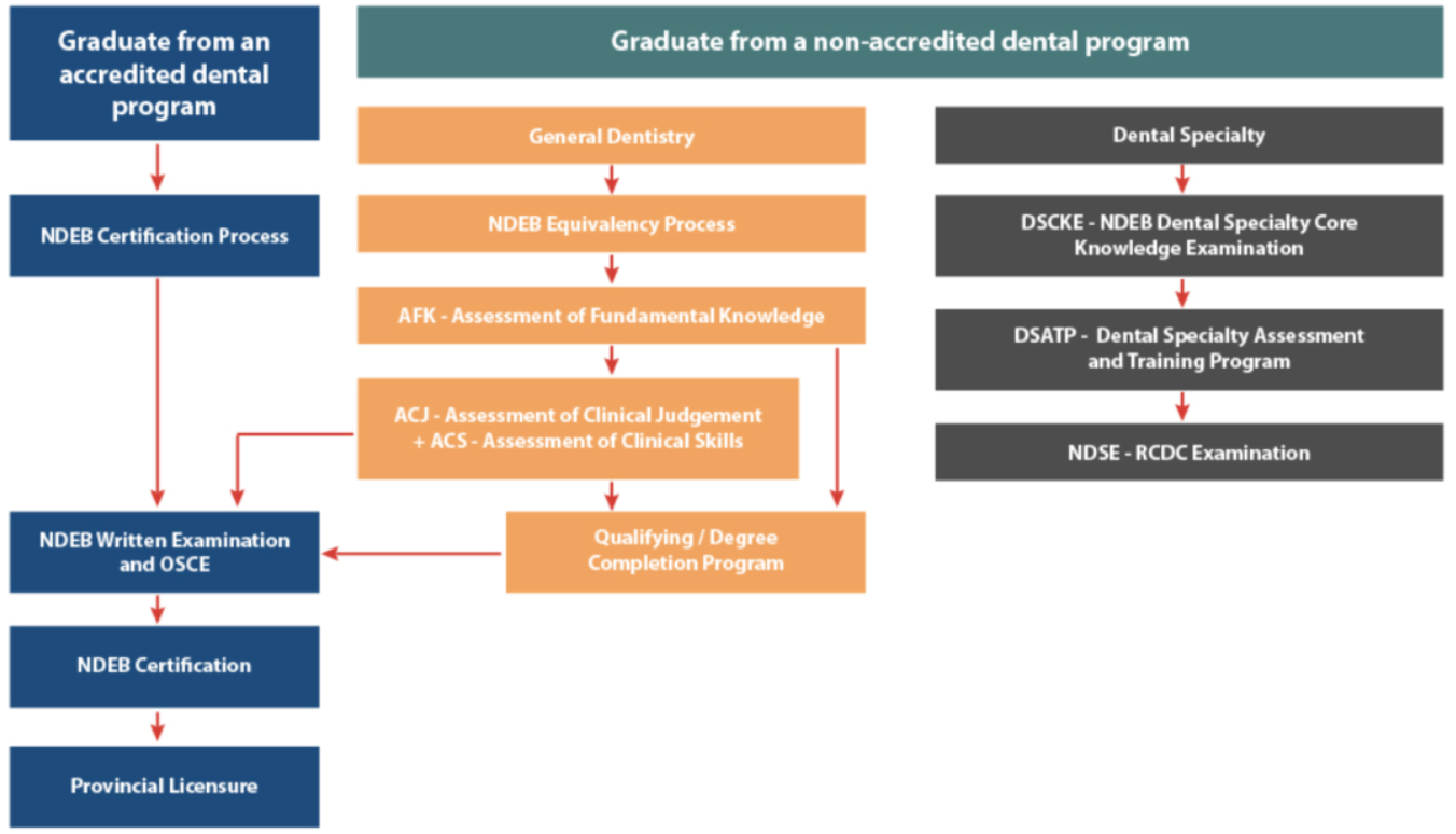 针对加拿大认可的专业项目,毕业生可以直接参加执业考试,通过后即可成为执业牙医,但如果读的牙医项目不是加拿大认可的,则需要有额外的认证和考试。比如一个在中国牙医专业毕业的学生,并获得中国的执业资格,这个时候想来加拿大继续做牙医,但是又不想再读加拿大的牙医学院。可以参加NDEB的考试,通过后也可以拿到加拿大的执业资格。