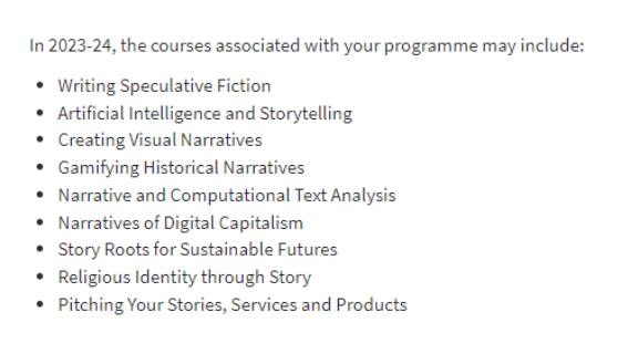另外, 学生还可以在核心课程之外自由选择其他相关课程进修 ,这些课程每年并不固定,2023-24学年的课程包括: