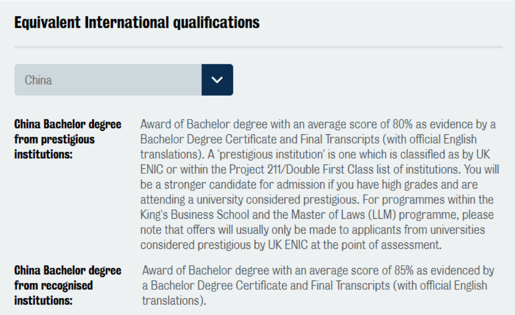 KCL对研究生申请者的要求是其 本科学校必须通过UK NARIC(National Academic Recognition Information Center),也就是英国学术认证中心的认证。