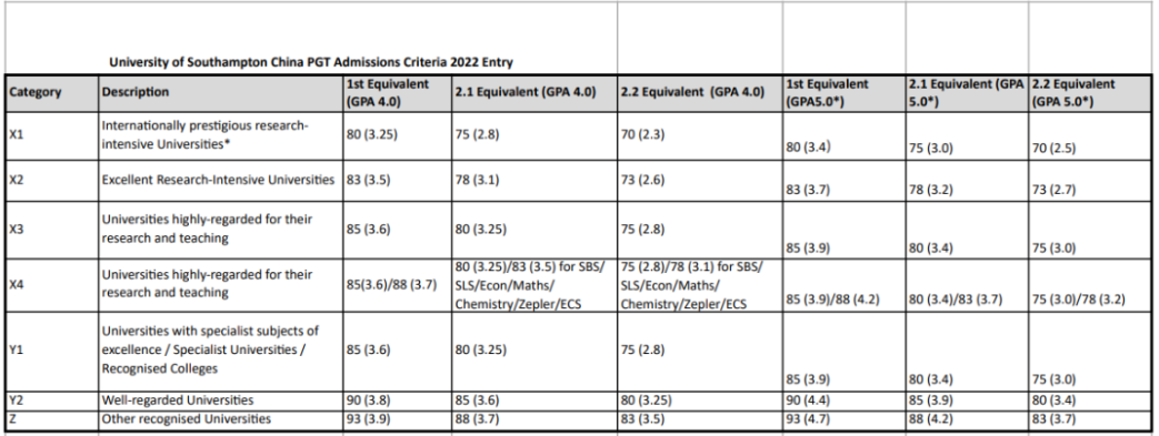 各个专业对不同级别的平均分有不同的要求。这当中, 商学院、工程和物理学院等只招收X1/X2/X3/X4的学生。而要求2:1的专业,一般要求均分为75/78/80/83。