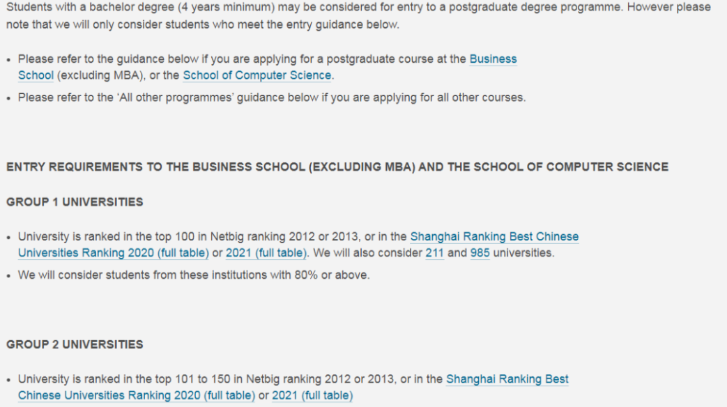 今年谢菲尔德主要参考了2021年交大的排名,该校的 管理学院和计算机学院只接收交大排名前100大学和985/211大学,平均分数最低要求75。