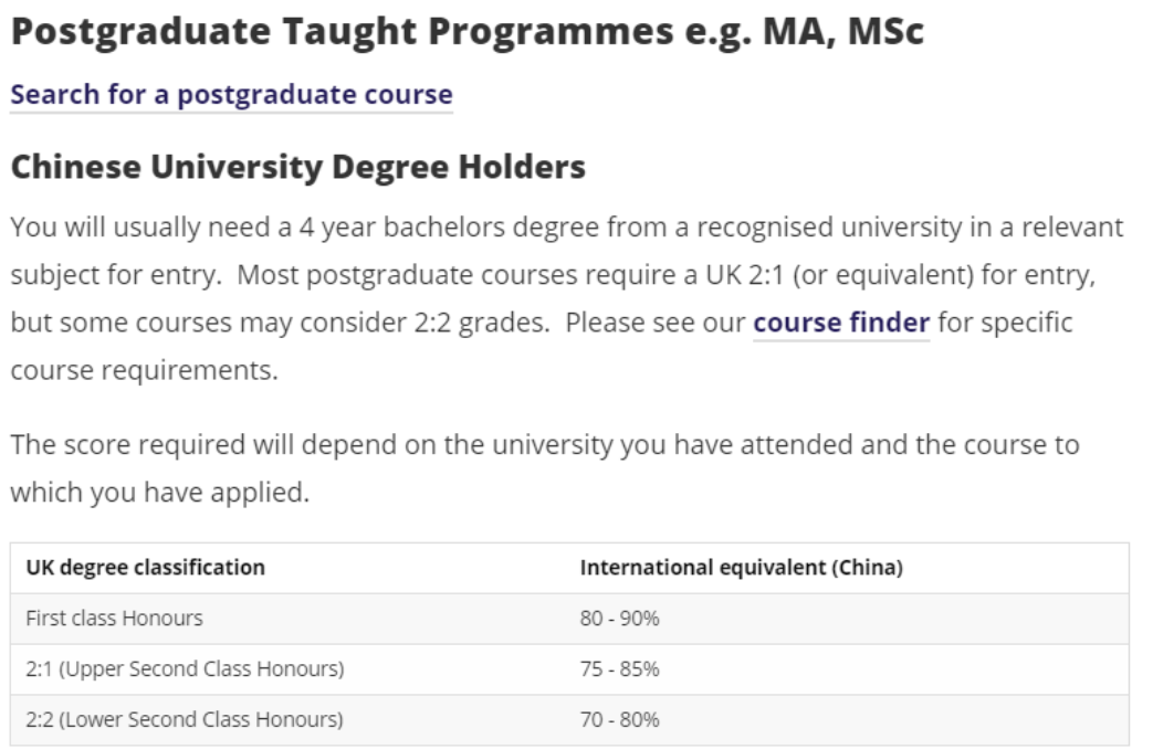 2:1学位的平均分要求分别为78/80/82/85/88,而对于一些专业,如会计与金融类等,要求Strong 2:1学位,相应的平均分要求会提高2~3分,分别为81/81/85/88/90。