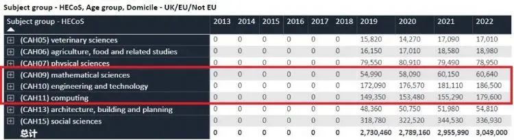 技术型人才越来越受重视,近几年STEM专业(科学、技术、工程和数学)也越来越受欢迎。根据UCAS数据显示,工程技术、计算机和数学三大专业占2022年申请总人数的14%,较去年增长7%。