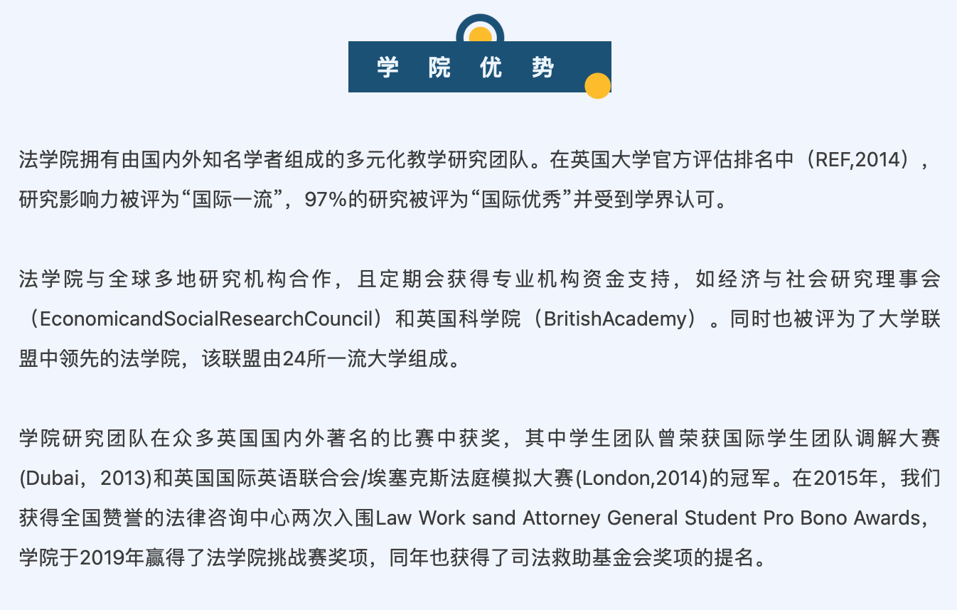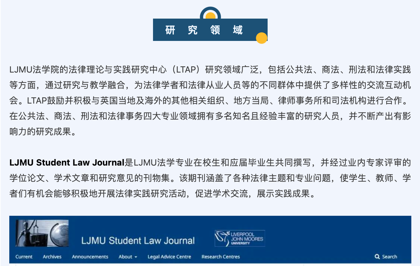 学院拥有丰富领先的学术研究,在行业更是开展了系列相关活动,其中包括法律理论与实践研究中心。该中心促进LJMU以研究为导向的教学,并通过发展我们的研究人员以及创建反映当前法律实践的课程模块,为卓越的教育做出贡献。该中心增强了学生学习体验,为法律研究活动提供重要指导和研究方向,让学生在学习专业理论的同时还可以得到社会实践。