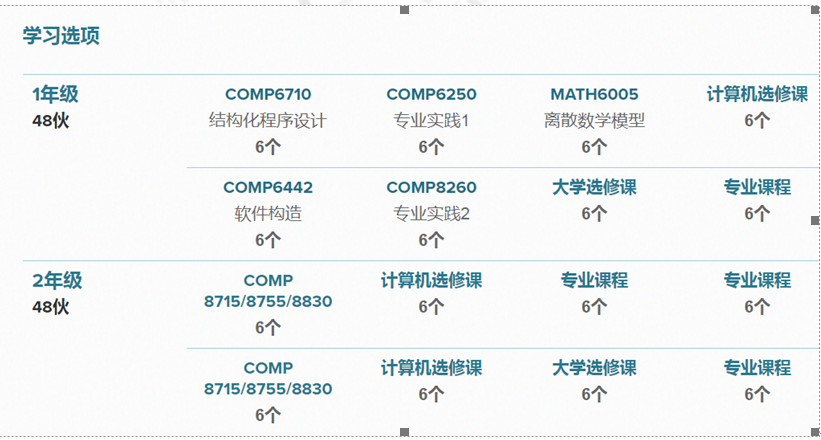 96 个单元必须包括: 自完成以下必修课程以来的 24 个单元: COMP6710 结构化编程 COMP6250 专业实践 1 COMP6442 软件构造 COMP8260 专业实践 2 以下基础课程之一的 6 个单元: